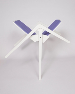 Convertible white chair with lavender interchangeable cushions. Converts from lounge chair to dining chair.